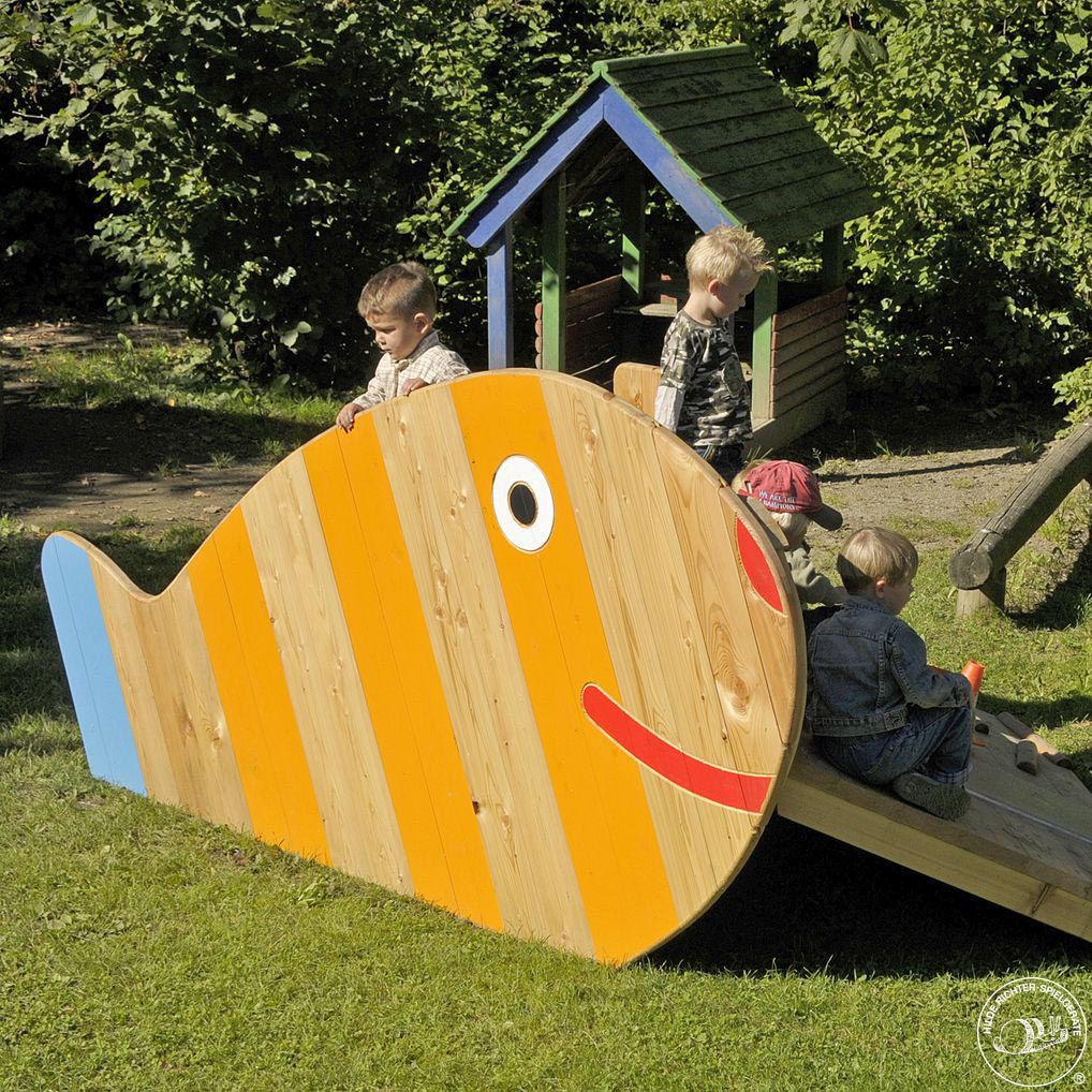 The small striped fish is a delightful playing area for small children. The friendly charisma of the figure is enhanced by the warm colours. There are different ways to climb up onto the triangular platform. The ramp has a smooth surface with lengths of wood set into it which serve as a crawling aid. There is a small sliding surface. The platform can also be reached via steps.Recommended For