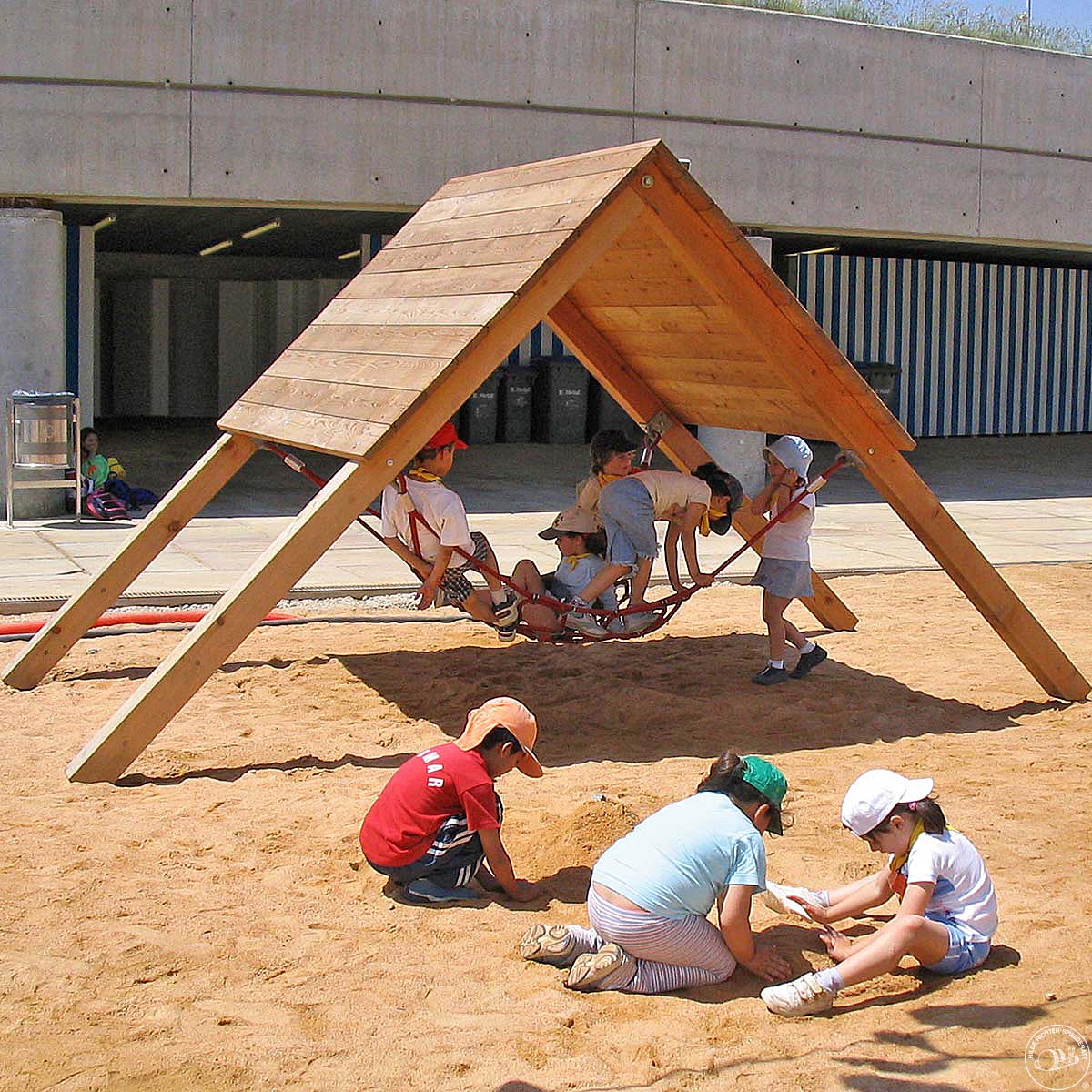 The broad pitch of the roof shelters a small rope structure in which children can sit or lie together. Gentle rocking creates a pleasant, relaxing movement of the net. The rope nest offers small and larger children a place to retreat or to relax and watch the world go by.