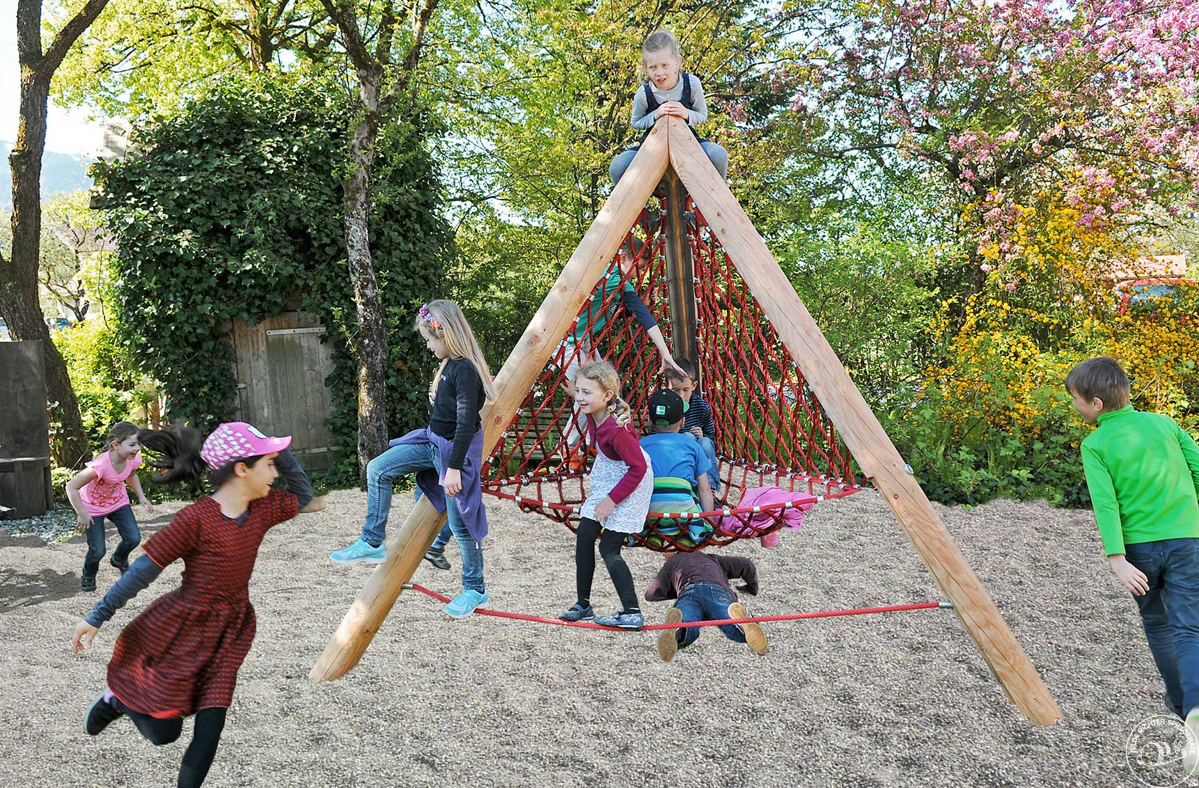 The wooden posts of the Rope Pyramid carry and virtually protect a net structure in which children love to sit or lie together.They also enjoy climbing to the top of this attractive piece of equipment via thenets. And the balancing rope below the open front of the net structure invites them to carry out little acrobatic exercises and promotes their sense of balance.